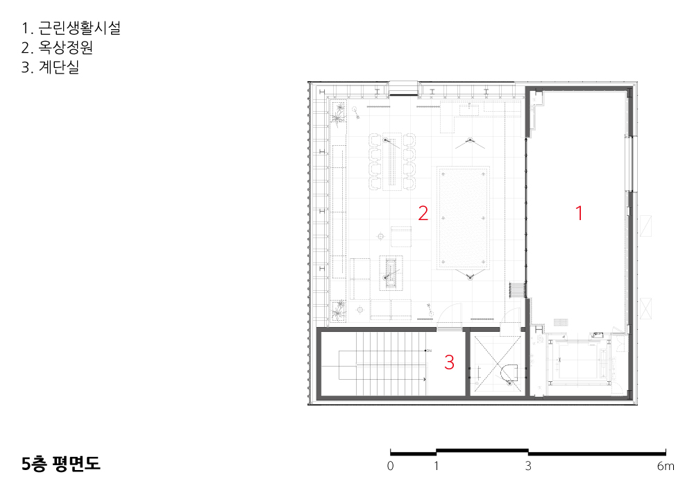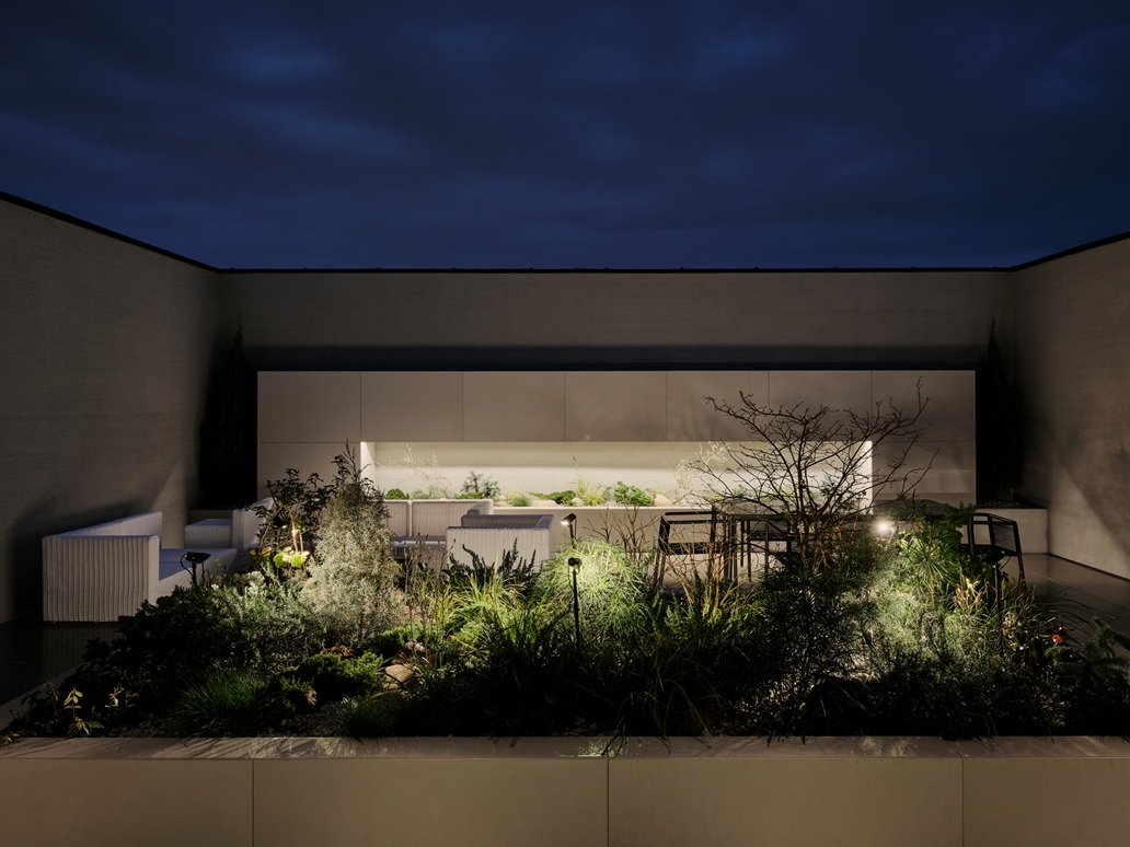 외부 디스플레이는 마치 커튼월 유리를 관통한 듯한 인상을 주도록 내부에서도 동일한 크기로 계획되었고, 내부 계단을 통해 각 층별 디자인 콘셉트가 반영된 공간을 경험할 수 있도록 구성했다. 최상층인 5층에는 프라이빗한 야외 중정 형태의 테라스를 마련해, 도심 속 정원과 같은 휴식 공간으로 기능하도록 했다.