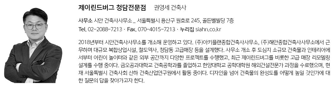 | 제이린드버그 청담전문점 설계자 | 권영세 _ 시안 건축사사무소 건축주 | (주)신세계인터내셔날 감리자 | 건축사사무소 샘 시공사 | 건축 _ (주)알스퀘어 / 인테리어 _ (주)삼원에스앤디 설계팀 | 한승희 설계의도 구현 | 시안 건축사사무소 대지위치 | 서울특별시 강남구 압구정로 주요용도 | 제1종 근린생활시설(소매점) 대지면적 | 423.60㎡ 건축면적 | 176.63㎡ 연면적 | 999.88㎡ 건폐율 | 41.70% 용적률 | 176.74% 규모 | B1F - 5F 구조 | 기존 _ 철근콘크리트구조 / 증축 _ 철골구조 외부마감재 | NBK 테라코타 판넬, STO 외단열시스템 내부마감재 | 도장, 대리석, 금속, 목재 설계기간 | 2023. 05 - 2024. 07 공사기간 | 2024. 04 - 2025. 03 사진 | 김동규 구조분야 | (주)센구조연구소 기계·기계소방분야 | 한국설비연구(주) 전기·전기소방분야 | (주)한길이앤씨 인테리어분야 | 쇼메이커스 커튼월분야 | (주)제이앤에스 한백 |