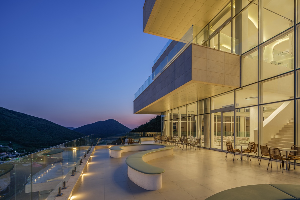 내부공간의 콘셉트는 외부형태가 갖는 개방적인 이미지를 내부공간까지 연속적으로 느낄 수 있도록 하는 것이다. 건축 디자인의 내·외부가 같은 지향점을 가지고 표현되면, 공간을 이용하는 이들에게 단순하지만 명확한 경험을 제공하게 된다. 1층인 로비에 진입하면 카운터 상부에 있는 곡선 형태의 오픈공간과 거대한 샹들리에가 맞이하게 되는데, 바로 옆에 설치된 대형 계단을 통해 1·2층 공간이 연속되는 느낌을 받는다. 이러한 개념은 오픈공간의 위치를 서로 달리하며 4개 층이 동일하게 반복되는데, 외부 형태에서 보이는 동일 요소의 다양한 반복이라는 개념과 같은 맥락을 보여준다. 수평적으로는 내부 공간, 테라스, 바다로서의 연속성이, 수직적으로는 4개 층이 곡선형의 오픈공간과 계단으로 연속되는 모습이다. 사용자는 수평·수직 공간의 시각적 확장감을 경험할 수 있다. 인테리어에 사용된 마감재의 색채 분위기 통일과 세심하게 선택된 가구·소품들 또한 공간의 완성도를 한층 높이는데 일조했다.