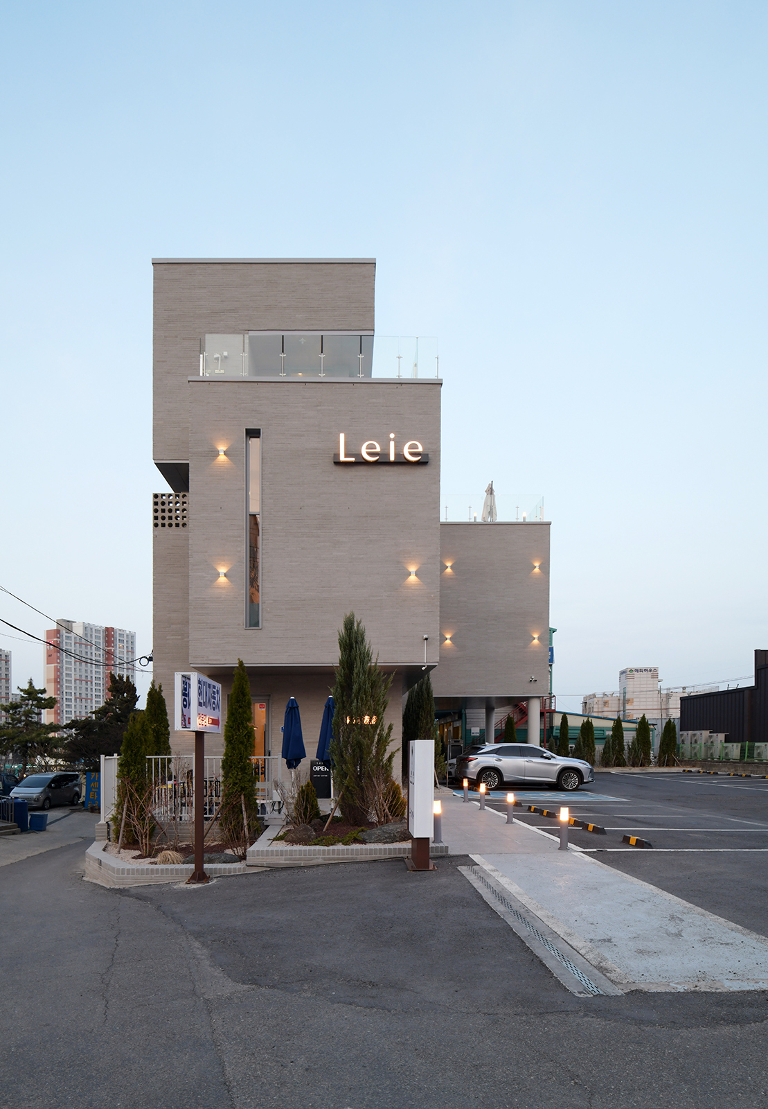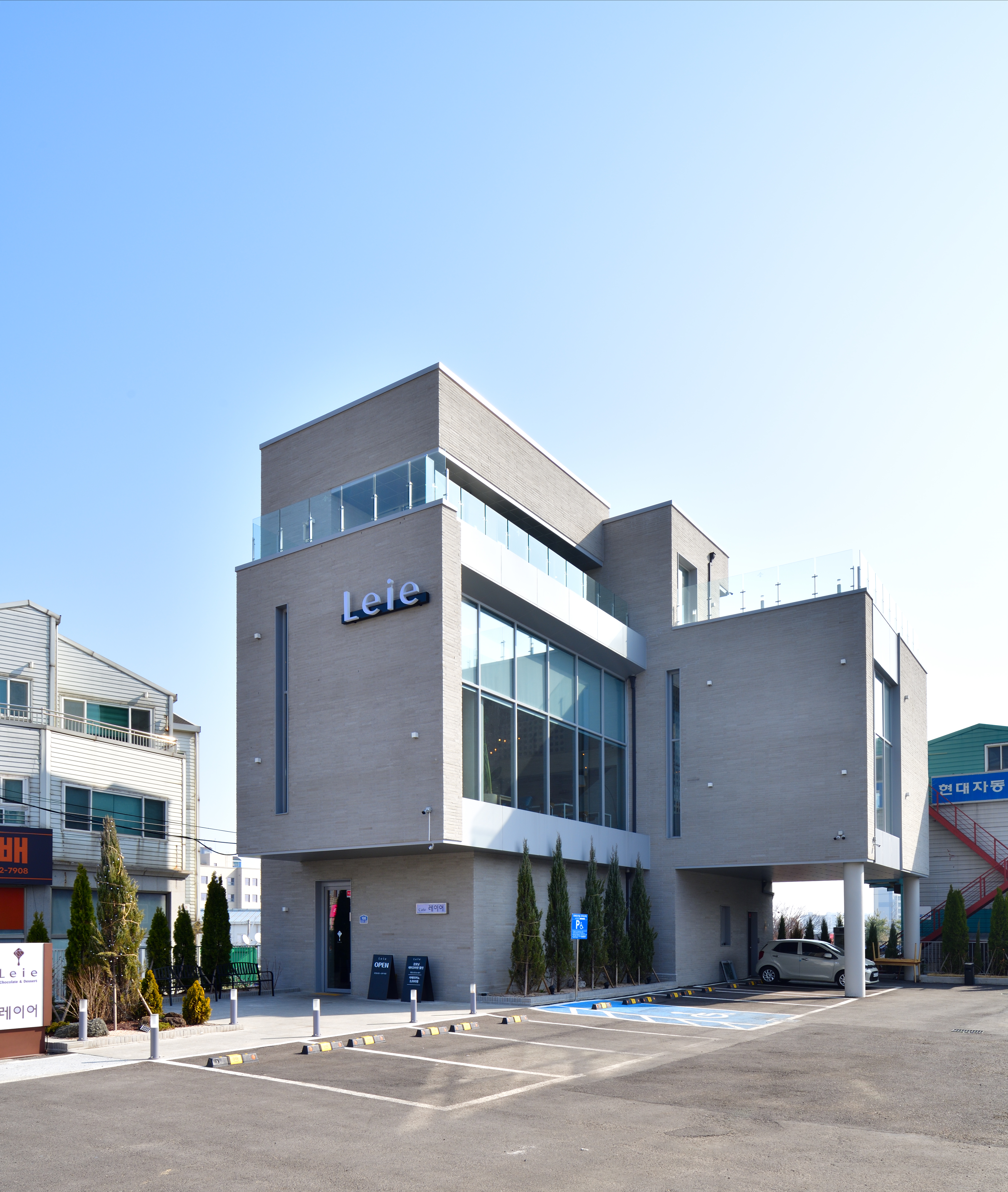 자칫 점잖고 길거리에 놓인 일반적인 건물과 밋밋한 마을에 나름대로의 멋을 부린 아이디어가 필요했기에 양감(Mass)의 변화가 필요했다. 하지만 한편으로는 예상치 못한 공사비의 상승으로 파격적인 디자인은 엄두를 낼 수 없었고 건축사의 입장에서 내부 마감을 과감히 없애고 노출콘크리트 제물마감을 제안했다. 하지만 다소 거친 콘크리트의 표면과 카페라는 공간에서의 먼지 비산에 대한 건축주의 걱정이 있어 내부 벽면마감을 코팅제로 도색을 하게 되었다. 그러나 도장 공사 후 예상 밖 콘크리트의 수분흡수에 따른 거칠고 보기 흉한(칙한) 색의 등장으로 모두 난처한 상황에 놓이게 되었다. 겪어보지 못한 시행착오를 거치면서 결국 공사비와 공사기간에 문제가 생겼다. 결국 콘크리트 본연의 색에 가까운 밝은 회색의 도장 공사를 한 후 천만다행으로 비교적 기존의 콘셉트에 가까운 질감의 결과를 만들어낼 수가 있었다. 외벽의 롱브릭 벽돌 그리고 맑은 유리와 조화된 알루미늄 프레임을 통해 다소 지체되긴 했지만 우여곡절 끝에 어느 정도 만족할만한 공간이 탄생하게 되었다. 한 가지 덧붙인다면 ‘벨기에’에서 유학을 하고 온 건축주 큰 아들의 ‘쇼콜라티에(chocolatier)’라는 흔하지 않은 초콜릿 자격을 좀 더 발전시키기 위하여 카페의 이름을 ‘레이어(Leie, 벨기에 강이름)’라고 부르기로 하고 브랜드 디자인공모를 통해 건물 간판과 머그컵 등에 적용을 했다. 아침 식사를 대신할 샌드위치로 오늘도 아침 8시가 되면 이곳은 도시인들의 마음을 마중하고 있다.