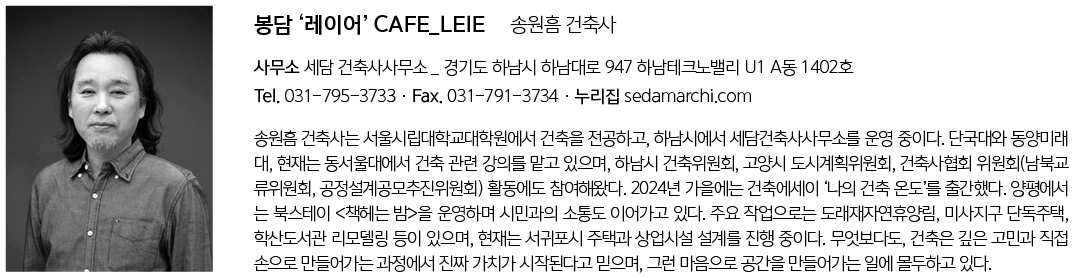 CAFE_LEIE Architect | Song, Won Heum _ SEDAM Architects Client | Kim, Dong ik Supervisor | SEDAM Architects Construction | SN Corp. Location | Wauri, Bongdam-eup, Hwaseong-si, Gyeonggi-do Program | Neighborhood facilities Site area | 817.00㎡ Building area | 163.16㎡ Gross floor area | 397.21㎡ Building to land ratio | 19.93% Floor area ratio | 53.65% Building scope | 4F Structure | RC Exterior finishing | Brick Interior finishing | Exposed Concrete, Paint on concrete Design period | Nov. 2022 - Aug. 2023 Construction period | Sep. 2023 - Nov. 2024 Photograph | Heo, Gang Hun Structural engineer | Seoul structure Mechanical·Electrical·Fire engineer | CODAM |