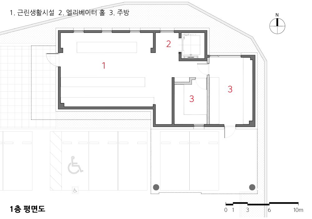 작은 신생도시 하남이라는 곳에서 두 젊은 아들과 함께 살아가고 있는 보통의 아버지(건축주)는 건축사인 나와 택지지구 상가주택을 지어 본 인연으로 ‘와우리’라는 마을에 또 하나의 땅을 마련하고 나를 불러주셨다. 텅 빈 나대지(전)에 어떤 형태의 건물을 놓을지 어떤 재료의 색으로 입힐지에 대해 수개월의 시간을 함께 고민하였다. 작지만 작지 않은 건물을 만들어 내는 것은 결국 건축사의 몫이긴 했지만 서로의 입장에서 믿고 의지하는 것만은 내내 계속되었다. 저렴한 공사비로 질 좋은 건축물을 기대한다는 것도 모순이지만 누구나 그러하듯이 이 프로젝트 역시 저렴한 공사를 할 수 있는 시공자를 선택할 수밖에 없었다. 그래서 설계기간 동안 공간 구성에 많은 시간과 많은 변경을 수반하게 되었다. 그렇게 소란스러운 나날들을 보내고 난 후에야 공간은 완성될 수 있었다.