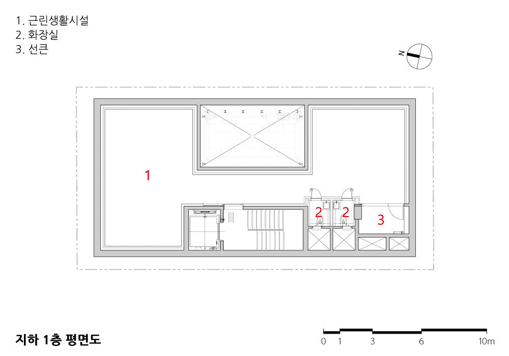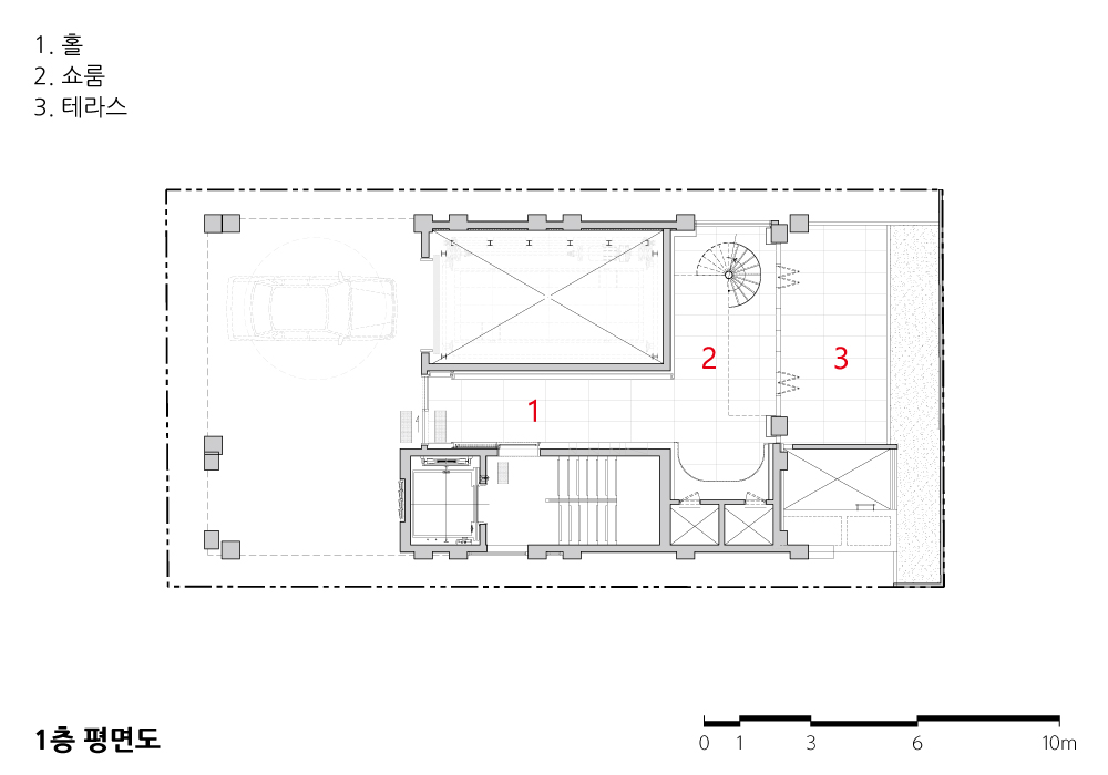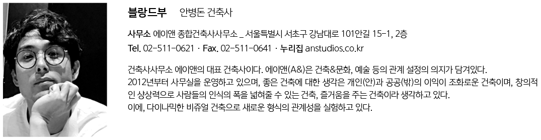 전면 4m 일방도로, 지하 20m 깊이의 터파기, 그로 인한 수많은 민원은 공기를 상당히 지연시켰고, 많은 시간이 흐른 뒤에야 준공을 받을 수 있었다. 현장에서 고군분투한 시공사와 인테리어팀 등 모든 관계자들께 감사드리며, 여러 어려움 속에서도 이해해주신 건축주께도 깊이 고마움을 전한다.