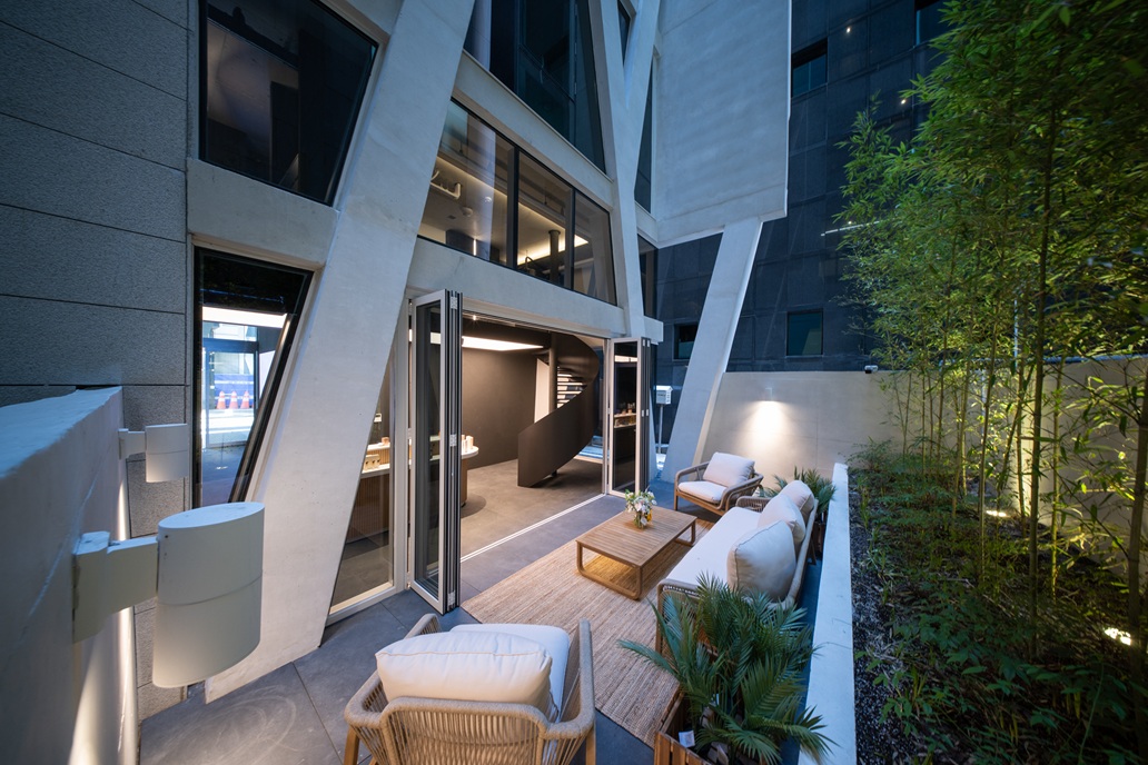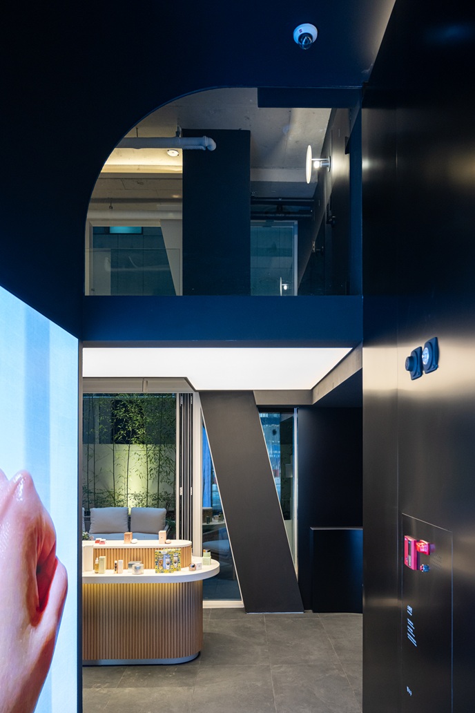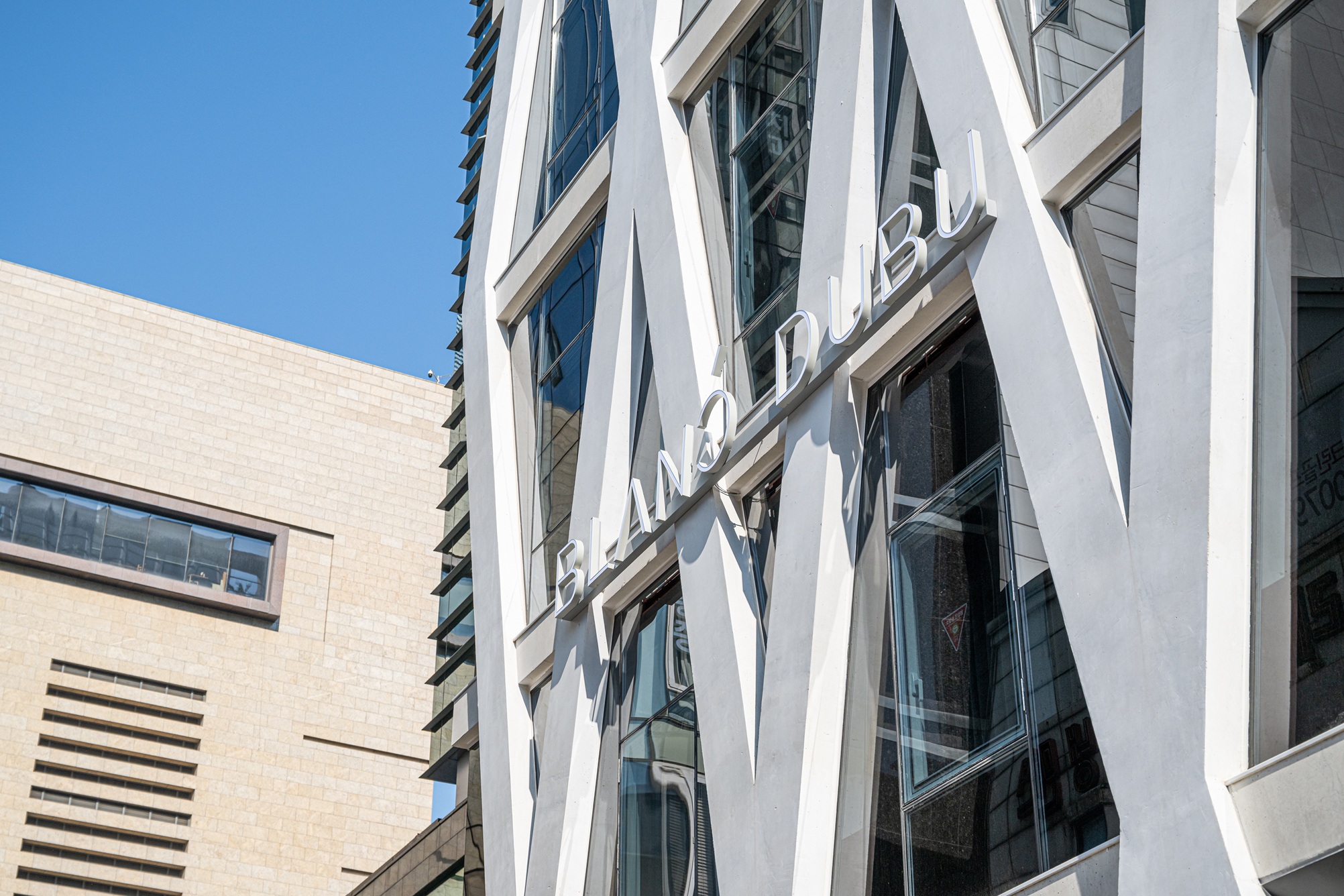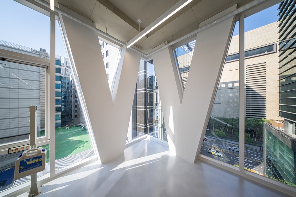 강한 형태적 역동성은 다소 단순한 매스 형태로 제안되었을 수 있으나, 이는 화이트 노출 콘크리트가 지닌 순수성과 ‘다이아몬드 같은 영원성’을 상징하는 블랑드부라는 회사의 브랜드 철학과도 맞닿아 있다. 1층은 최대한 비워 공공성을 부여하고, 코너를 열어 보이도록 해 플로팅 필로티의 개방감을 갖도록 했다.
