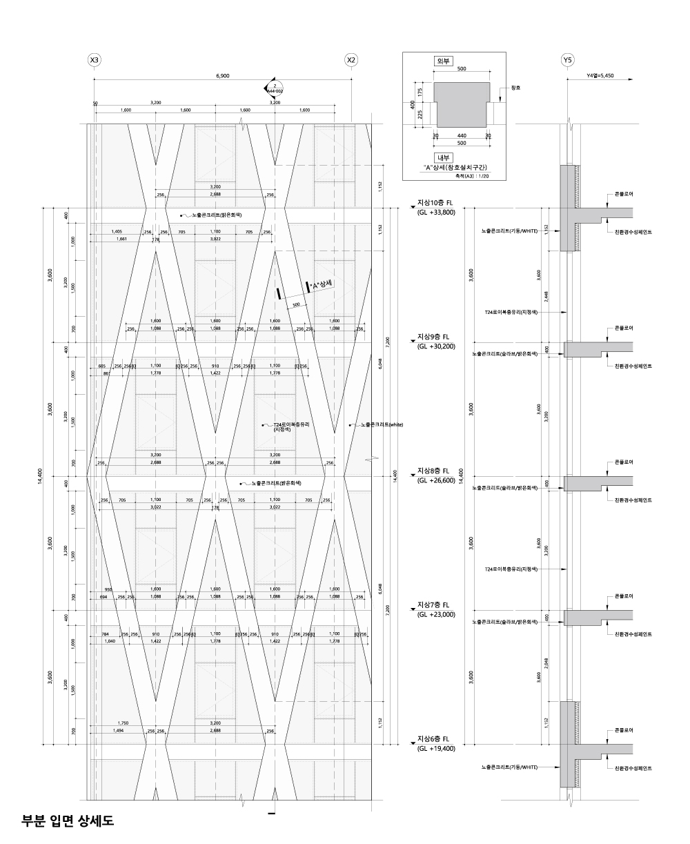 내부 기둥은 최대한 없애고, 구조는 외부로 드러내며, 천정 또한 플랫한 콘셉트로 초기안을 시작했다. 현재의 다이어고날 패턴은 이러한 구조적 고민에서 출발해 입면 파사드로 진화했다. 전면 도로에서 부지 끝까지 관통할 수 있는 동선을 계획해, 공간의 경계와 흐름을 확장하는 시각적 연속성을 유도했다.
