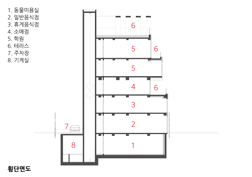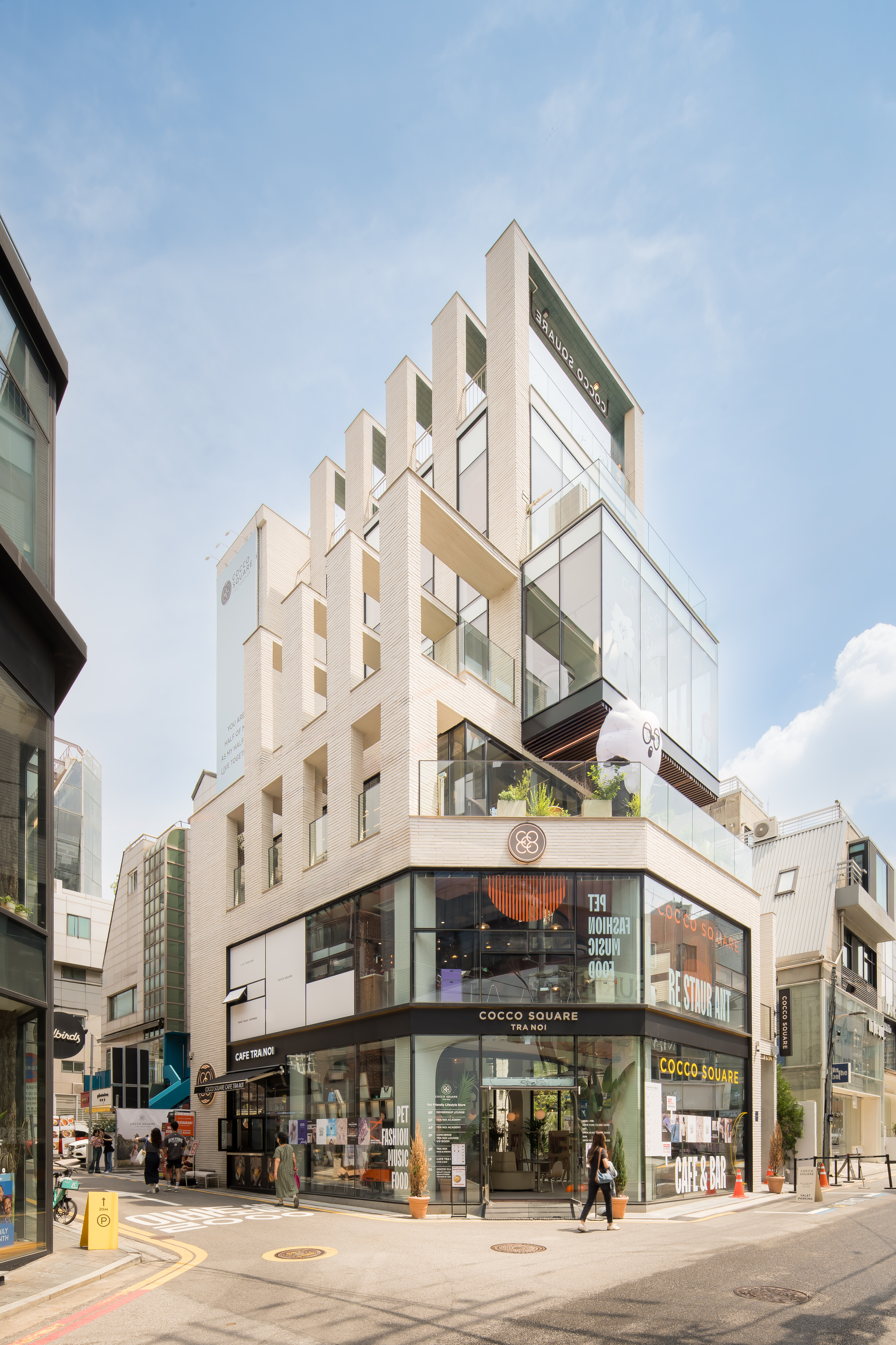 두 방향의 가로와 접한 대지조건을 활용해, 코너부에 상가를 배치함으로써 거리를 지나가는 사람들의 이목이 집중될 수 있도록 했다. 상하층을 직관적으로 연결할 수 있도록 주계단은 외부계단으로 계획하고, 지하로 내려갈 수 있는 별도의 계단을 마련했다. 상부 매스는 단순한 박스형이 아닌, 전면과 측면에서 리듬감 있게 쌓아올리는 구성을 통해 거리 분위기와 어울리는 입체감 있는 형태를 만들어냈다. 또한 모든 층에 크고 작은 테라스를 배치하여 거리와 시각적으로 연결될 수 있도록 했고, 외부를 향해 열린 공간 속에서 도시와 교감할 수 있도록 했다.