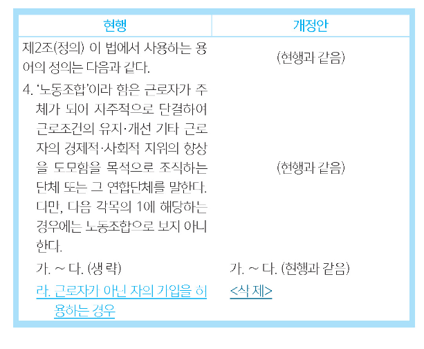 따라서, 개정안은 근로자가 아닌 자의 가입을 허용하는 경우 노동조합으로 보지 않는 현행 규정을 삭제하여, 특수고용노동자, 플랫폼노동자 등 다양한 일하는 사람의 단결권을 보장하고 ILO 등 국제기구의 권고를 따르도록 한다(안 제2조 제4호 라목 삭제).