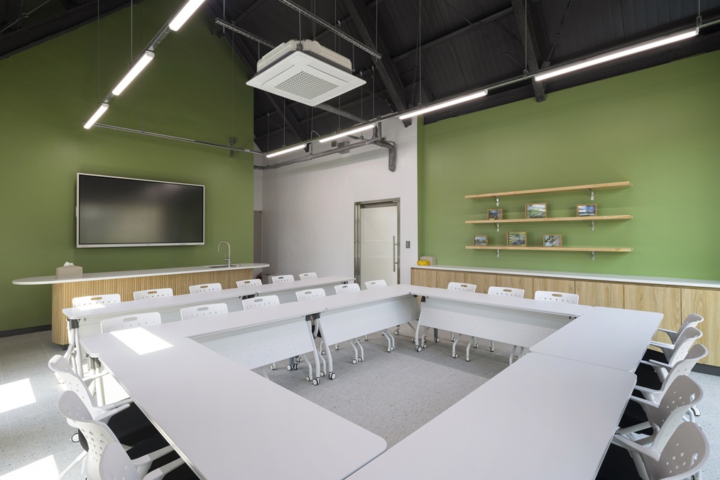 The first floor also houses a hands-on growing room with leafy green cultivation systems and an aquaponics unit, where fish waste provides nutrients for hydroponic plants. A small-scale experience area was arranged here, while a larger space on the second floor accommodates up to 30 people. The interior of the gable roof was left exposed, and a green accent wall was used as a spatial focal point. The growing rooms on the second and third floors are specialized cultivation zones with vestibules to block outside air. Strawberries are grown on the second floor, while leafy greens such as butterhead lettuce, frill ice, kaipira, and ezatrix are cultivated on the third.