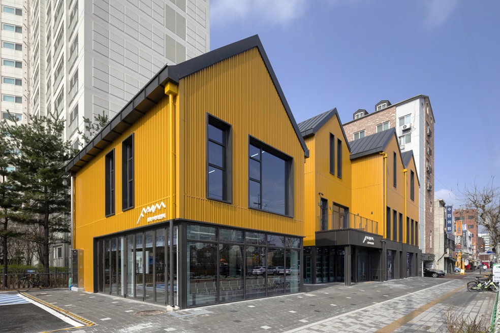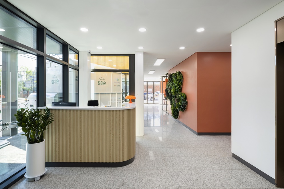 The site was previously a dark, neglected space surrounded by tall, unhealthy trees, permanently in shadow. To breathe life into this expressionless environment, a series of sloped roofs was introduced, along with a bright tangerine-toned façade. The front facing Hancheon-ro was articulated with varied depths to soften the visual impact from the street, while also encouraging a natural flow for pedestrians.