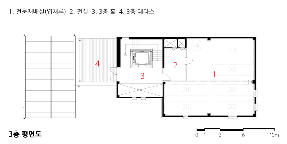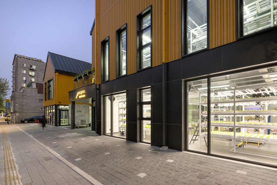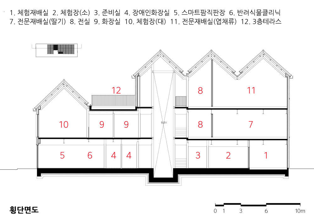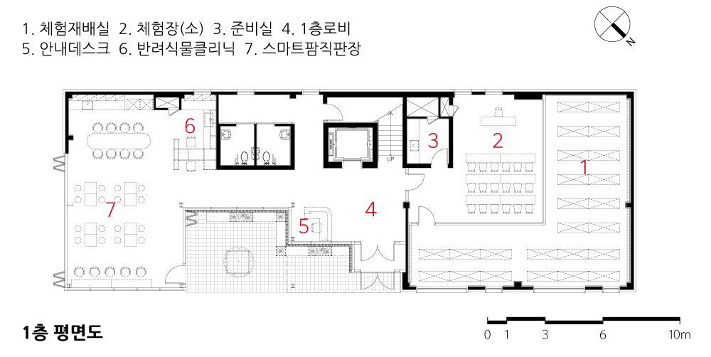 1층의 체험 재배실에는 엽채류 재배기와 아쿠아포닉스 시설(물고기 배설물이 수경재배 식물의 영양분이 되는 시스템)이 있으며, 소규모 체험장이 함께 배치되어 있다. 2층에는 약 30명을 수용할 수 있는 대규모 체험장을 계획하였다. 박공지붕의 내부 공간을 살리고, 공간의 포인트가 되도록 녹색 포인트 벽을 디자인했다. 2·3층의 재배실은 전문 재배실로서 외기를 차단하는 전실이 계획됐다. 2층에는 딸기, 3층에는 버터헤드, 프릴 아이스, 카이피라, 이자트릭스 등의 엽채류가 재배된다.