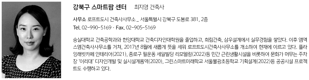 Gangbukgu Smart Farm Center Architect | Choi, Jiyoung _ Loft Architects&Urbanists Client | Gangbuk District Office Supervisor | Jongro Architects Construction | Yooho Development Project team | Park, Juhee / Kang, Yeonwoo Location | Beon-dong, Gangbuk-gu, Seoul Program | a temporary building (a temporary store for direct trade in agricultural products / a fixed greenhouse for agriculture) Site area | 689.90㎡ Building area | 268.97㎡ Gross floor area | 650.31㎡ Building to land ratio | 38.99% Floor area ratio | 94.26% Building scope | 3F Structure | Steel Structure Exterior finishing | THK0.5 galvanized steel sheet Interior finishing | Water based paint, Granite Design period | Oct. 2023 – May 2024 Construction period | Jun. 2024 – Feb. 2025 Photograph | Lee, Jaesang _ 770 studio Structural engineer | Moa Structure Mechanical·Electrical·Fire engineer | Jeongchan Engineering |