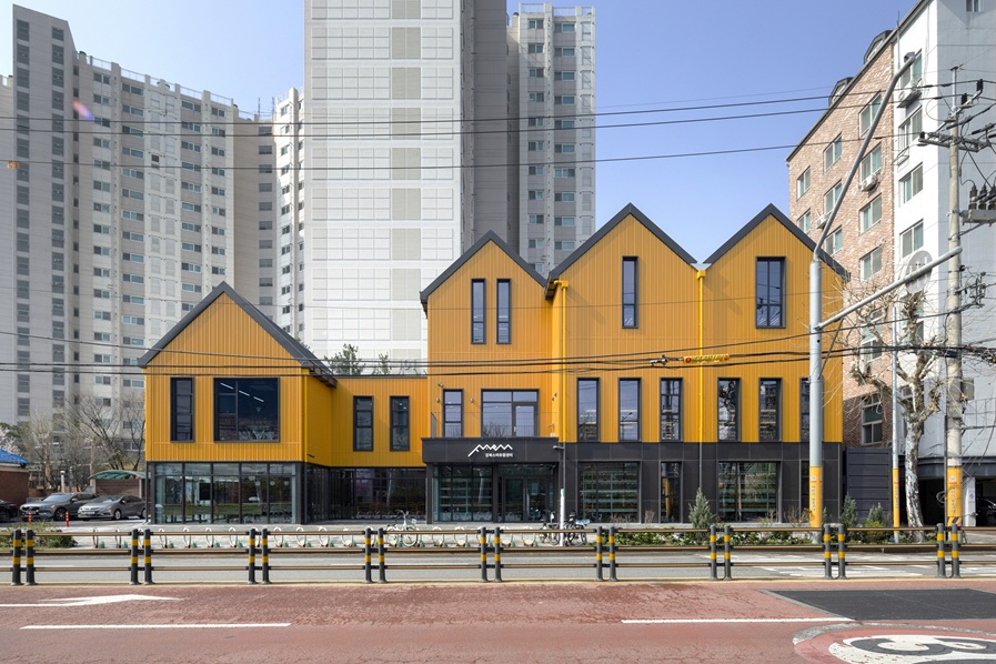 대상지는 상태가 좋지 않은 키 큰 나무들로 둘러싸인, 영구 음지에 놓인 어두운 공간이었다. 표정 없는 대상지에 활력을 불어넣고자 연속된 경사 지붕을 계획했으며, 밝은 귤색의 입면을 선택했다. 한천로를 바라보는 정면에는 요철을 적용해 대로변에서의 시각적 부담을 줄였으며, 보행로에서는 자연스러운 동선을 유도했다.