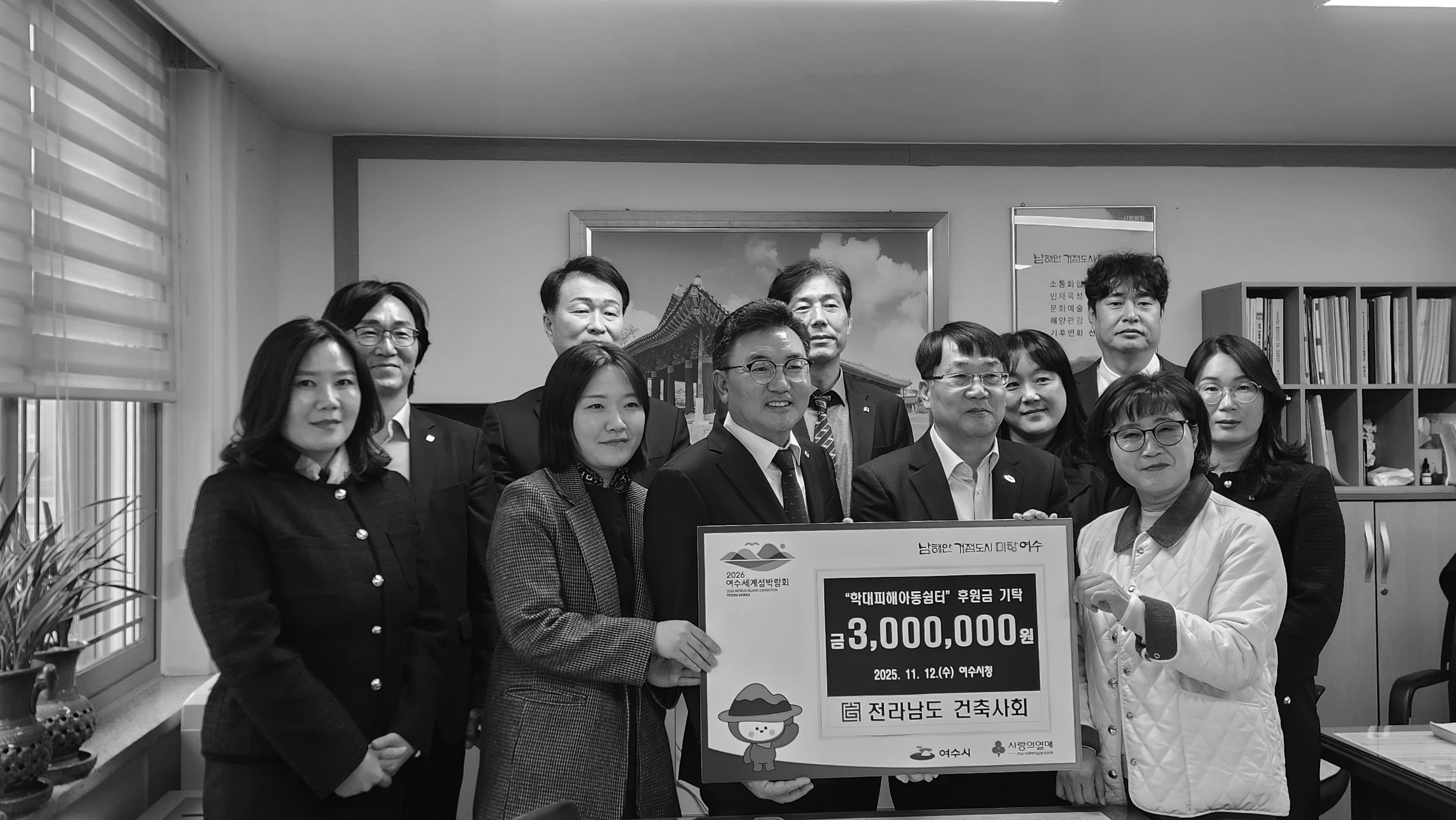 전라남도건축사회는 11월 12일 여수시청 복지교육국장실에서 지역 학대피해아동쉼터에 후원금을 전달했다. 이날 후원금 전달에는 전라남도건축사회 이경일 회장, 배종수 부회장, 고철주 여수지역건축사회장 등 도협회 관계자 8명과 여수시 복지교육국장, 아동보호전문기관 시설장, 시청 관계자 등이 참석했다.