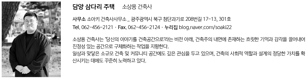 | 담양 삼다리 주택 설계자 | 소상용 건축사_ 소아키 건축사사무소 건축주 | 김광래, 윤정미 감리자 | 소아키 건축사사무소 시공사 | 시권일 설계팀 | 황인우 설계의도 구현 | 소아키 건축사사무소 대지위치 | 전라남도 담양군 담양읍 삼다리 주요용도 | 단독주택 대지면적 | 1,866.00㎡ 건축면적 | 150.00㎡ 연면적 | 195.19㎡ 건폐율 | 8.04% 용적률 | 10.46% 규모 | 2F 구조 | 철근콘크리트구조 외부마감재 | 장벽돌 내부마감재 | 바닥 - 강화마루 / 벽 - 석고보드 위 실크벽지 / 천장 - 지정도장 설계기간 | 2024. 07 - 2025. 01 공사기간 | 2025. 02 – 2025. 07 사진 | 이재민 _ 소노코로 구조분야 | (주)에이펙스 기계설비·전기·소방분야 | (주)팔마이엔지 인테리어 | 고율리 _ 디자인률 |