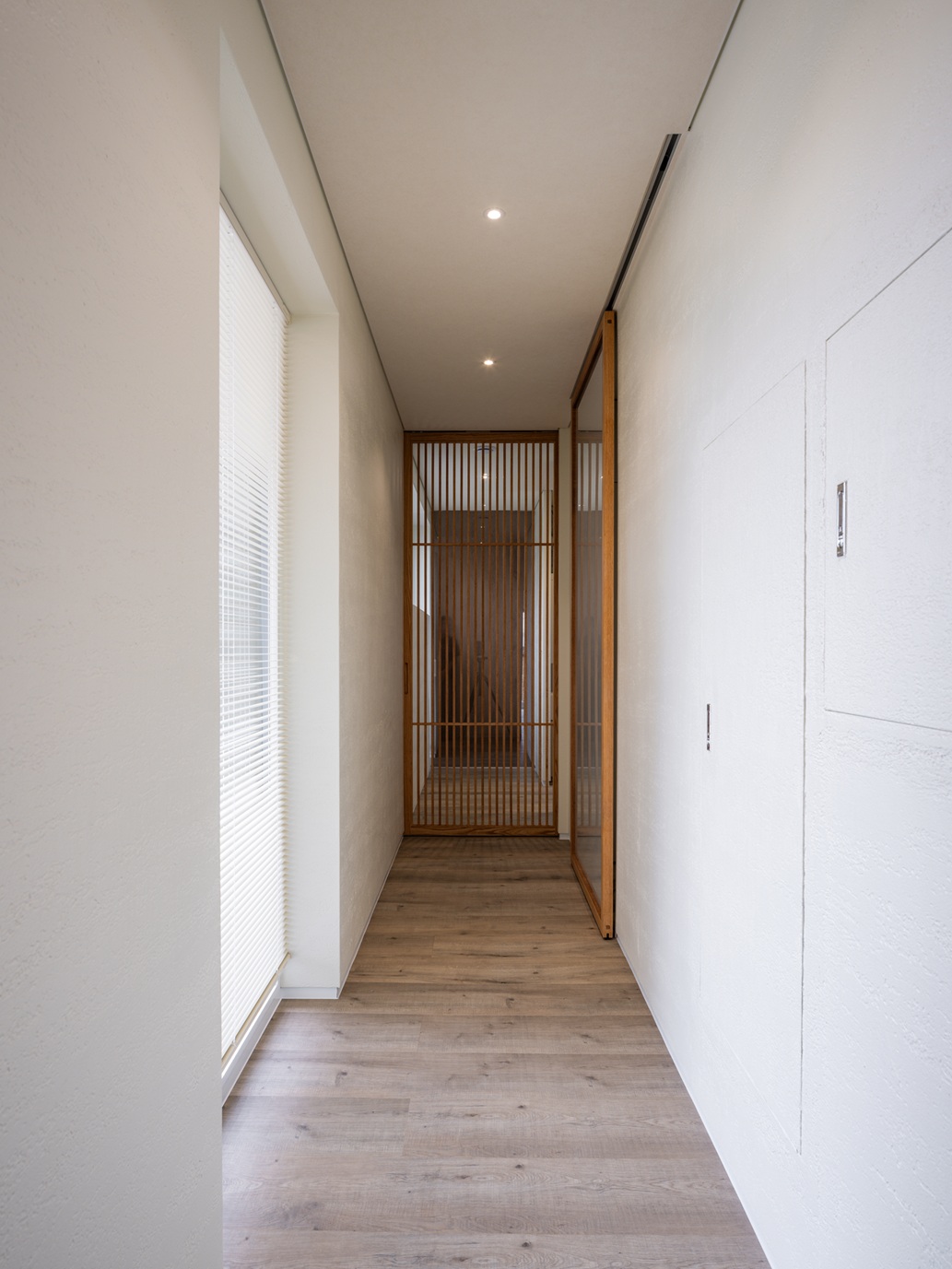 On the road-facing side, the mass of the building functions as a wall, clearly separating the public space outside from the private interior. A transitional buffer space was introduced at the entrance to create a natural shift from public to private. The entryway is designed as an enclosed area, with an open ceiling that frames the sky in a square, guiding visitors into the house through this thoughtfully crafted space.