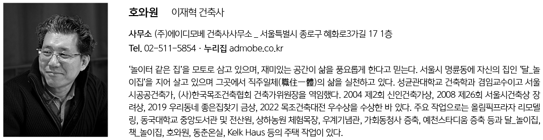 | 호와원 설계자 | 이재혁 건축사_ (주)에이디모베 건축사사무소 감리자 | 이재혁 _ (주)에이디모베 건축사사무소 시공사 | 배용근 _ 주식회사 하눌종합건설 설계팀 | 이주화, 김현종 대지위치 | 서울특별시 종로구 명륜3가 주요용도 | 다가구주택 대지면적 | 112.4.0㎡ 건축면적 | 57.05㎡ 연면적 | 147.01㎡ 건폐율 | 50.51% 용적률 | 130.79% 규모 | 3F 구조 | 철근콘트리트구조, 일반목구조 외부마감재 | 벽_ 스타코 플렉스 / 지붕_ THK5.0 칼라강판 창호_ 드리움 PVC 시스템창호 + thk39 로이삼중유리, VELUX VSE + thk24 복층유리 내부마감재 | 바닥_ thk8 구정마루 / 벽+천장_ 종이벽지 기둥+보_ 구조용 집성목 / 계단재_ thk30 애쉬 집성목+투명 스테인 타일_ thk9 무광 자기질타일(600x300, 150x150), 윤현상재, 포천 설계기간 | 2018. 07 - 2019. 03 공사기간 | 2019. 03 - 2019. 10 사진 | 김창묵 구조분야 | 김각경 _ 두항구조 엔지니어링 기계설비분야 | 김성률 _ 유영설비기술연구소 전기분야 | 김기표 _ 거산ENG |
