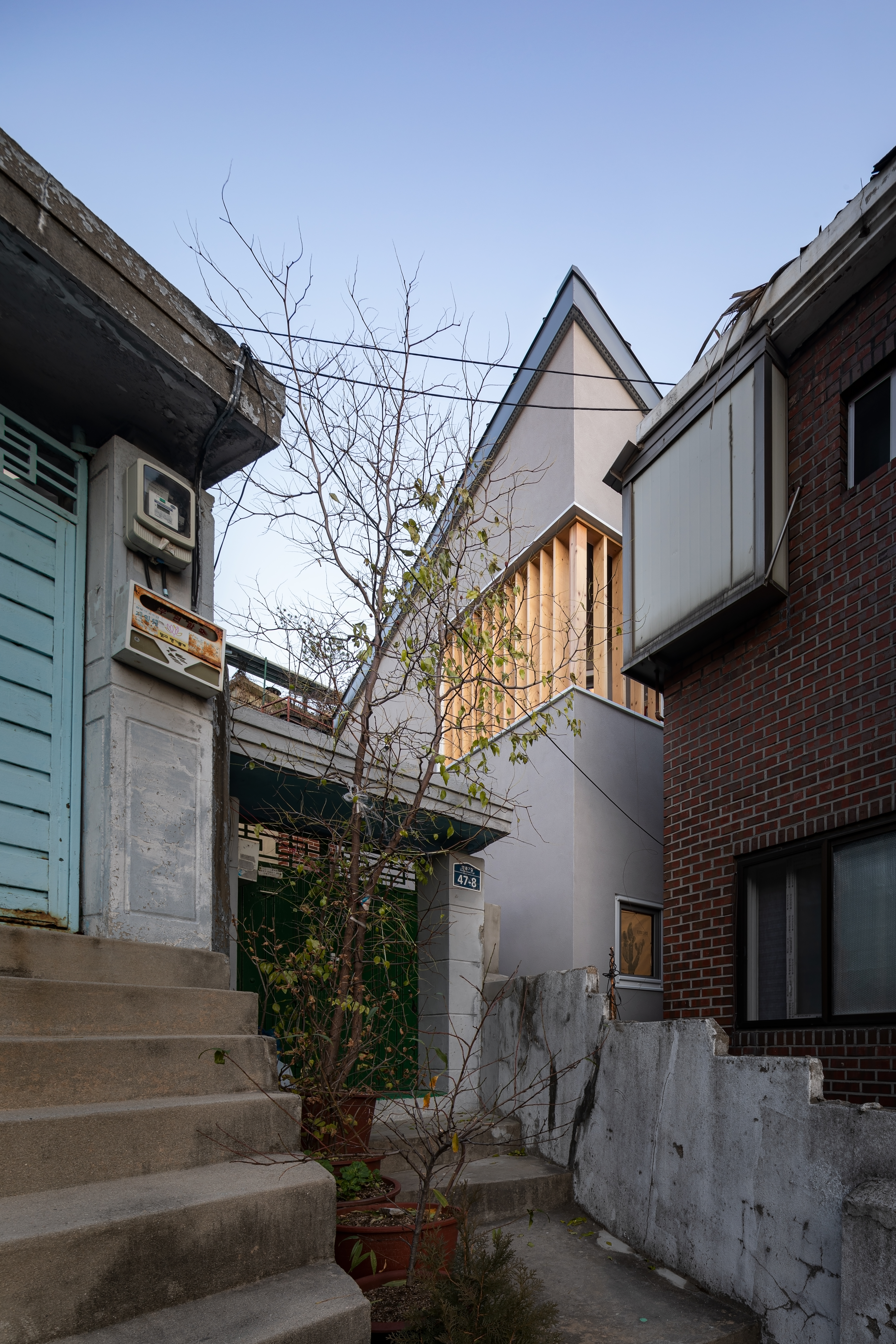 Strongly attached to Myeongnyun-dong, the owner chose the current site after several trials. The plot was tight, surrounded by houses, with only a 2-meter-wide access path. Adding to the difficulty, the first floor sat one level below the access road, making the house invisible from the street.