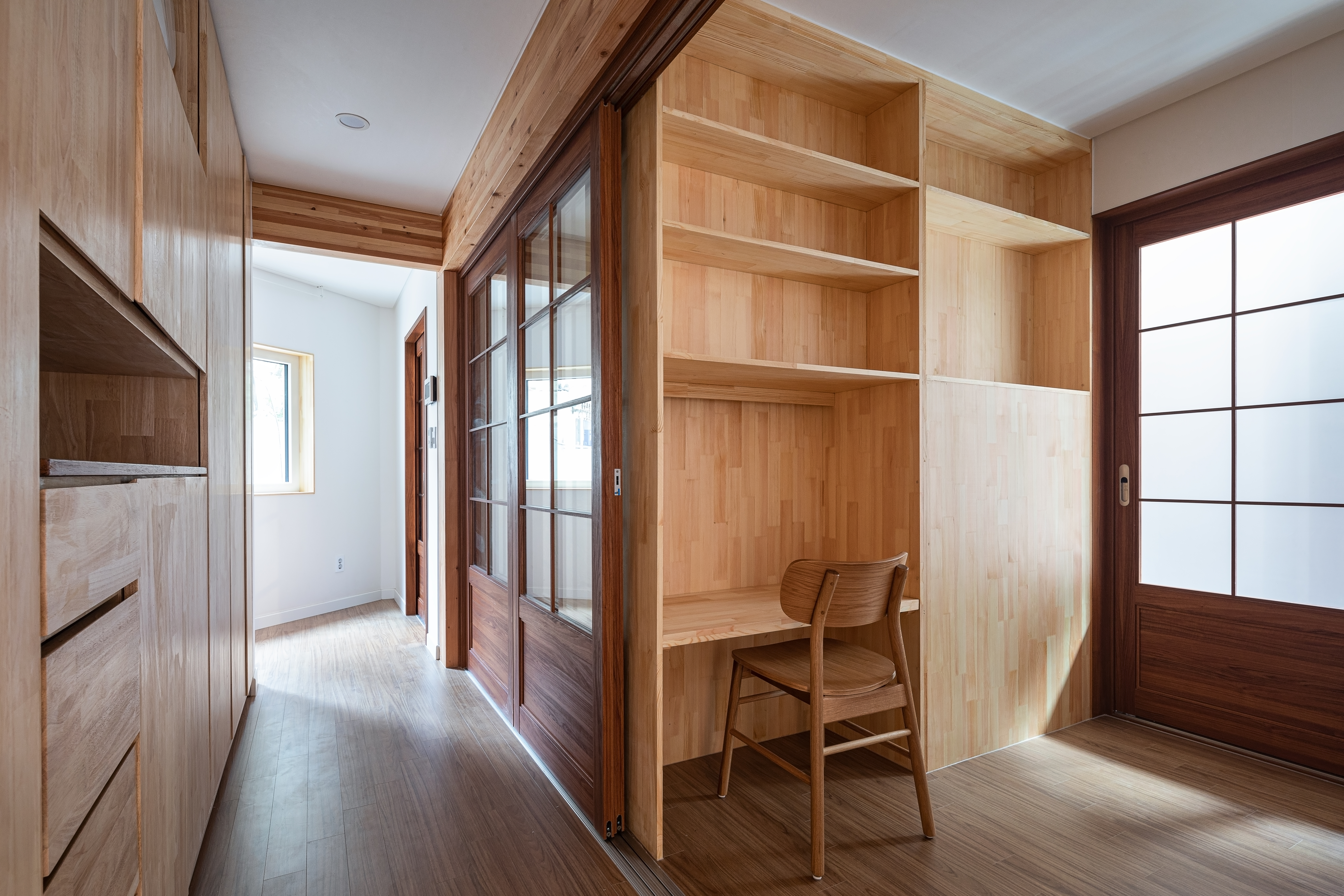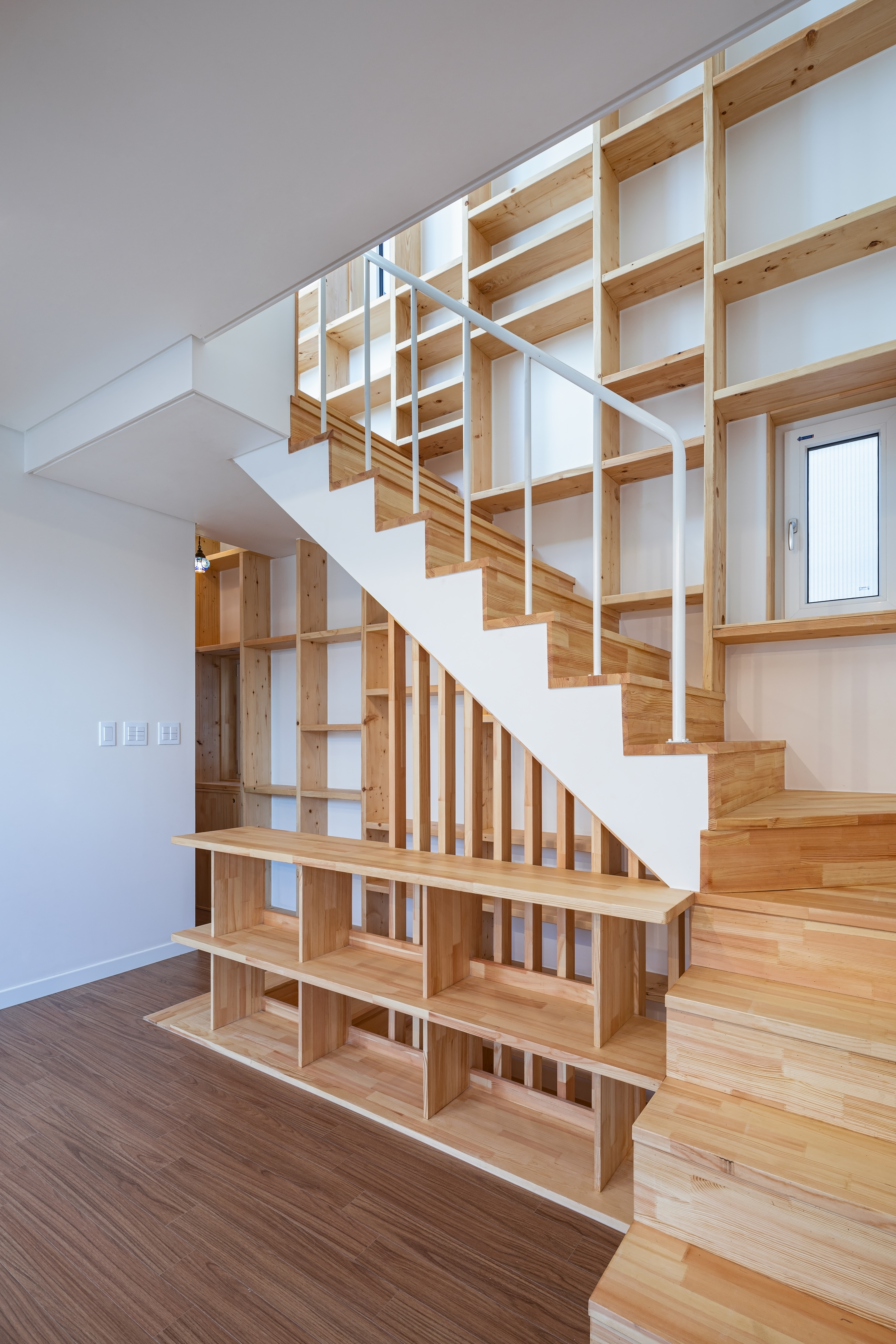빠른 공사와 입주를 위해서 목구조를 최대한 활용하기로 결정했고, 경사지이고 층간소음의 발생을 감안해서 임대세대가 들어갈 1층은 콘크리트구조로 하고 2층, 3층의 주인세대는 목구조와 중목구조가 섞인 구조방식을 채택했다. 경골목구조와 중목구조를 섞어 사용해 합리적인 공사비와 3층에서의 넓은 개방감을 얻게 되었다. 2층에서 다락까지 연결되는 가족서가를 주요 구조재인 SPF 구조목을 사용하여 만들었고 창호 주변도 스프러스 집성목을 사용하여 전체적인 목재의 통일감을 주었다.