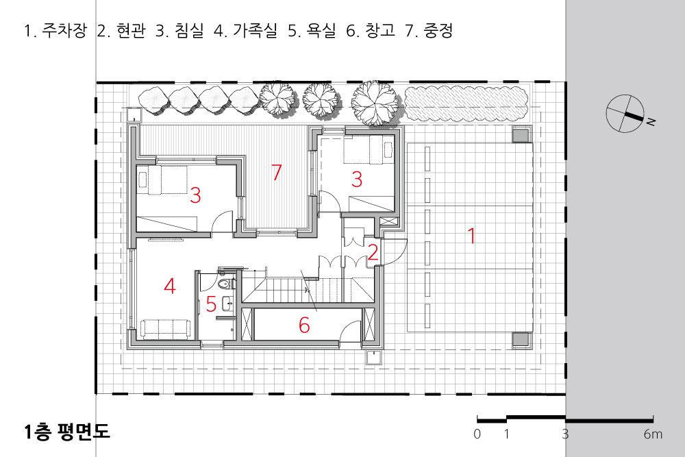 각각의 공간들과 연결되는 외부공간들을 고민하며 1층을 띄워 필로티 공간을 구성하고, 삶에서 잠시나마 여유를 느낄 수 있는 중정, 다락에서 연결되는 공원조망 테라스 등 대지의 조건에서 최대한 외부와 관계 맺을 수 있는 비워진 공간들을 삽입했다. 비워진 공간들에서 빛이 스며들고 바람이 드나들 수 있게 하고, 가족들의 다양한 삶의 모습들이 채워지길 바라며 공간을 구성했다.