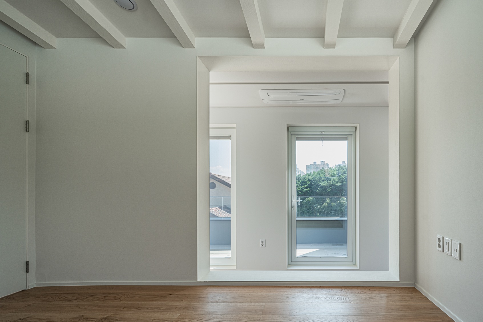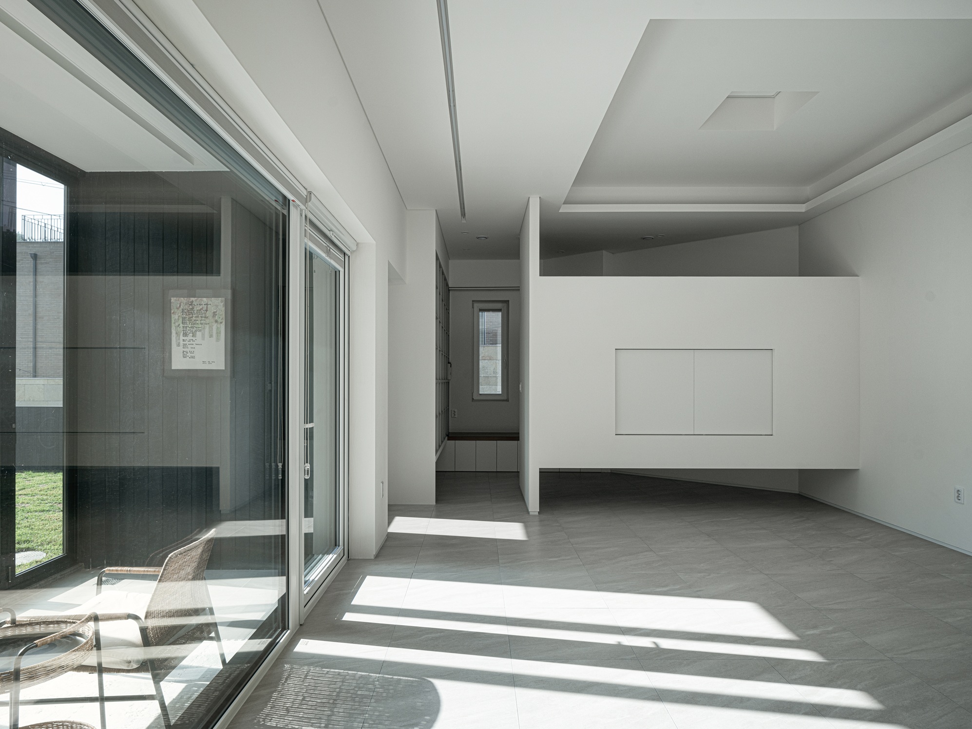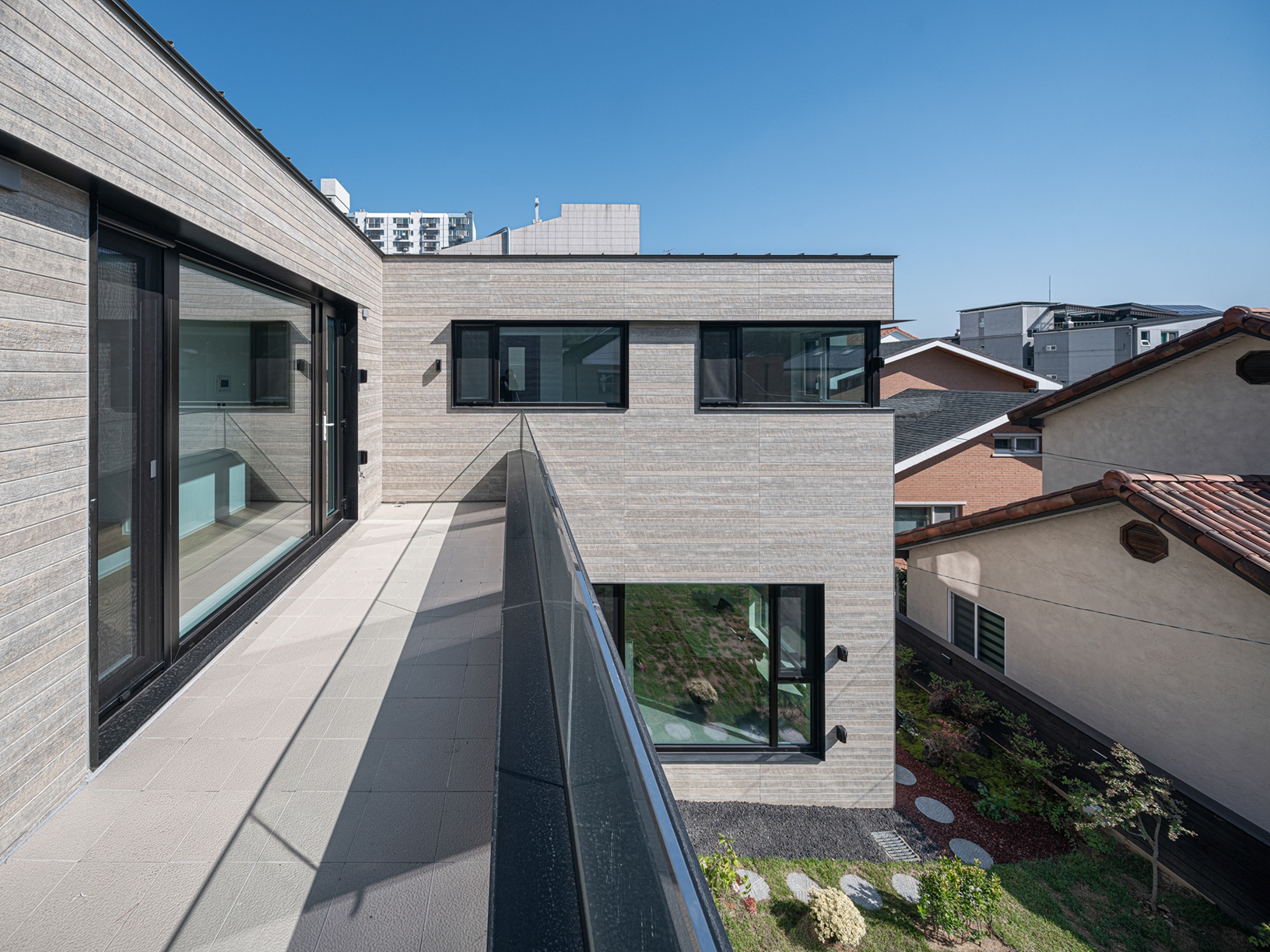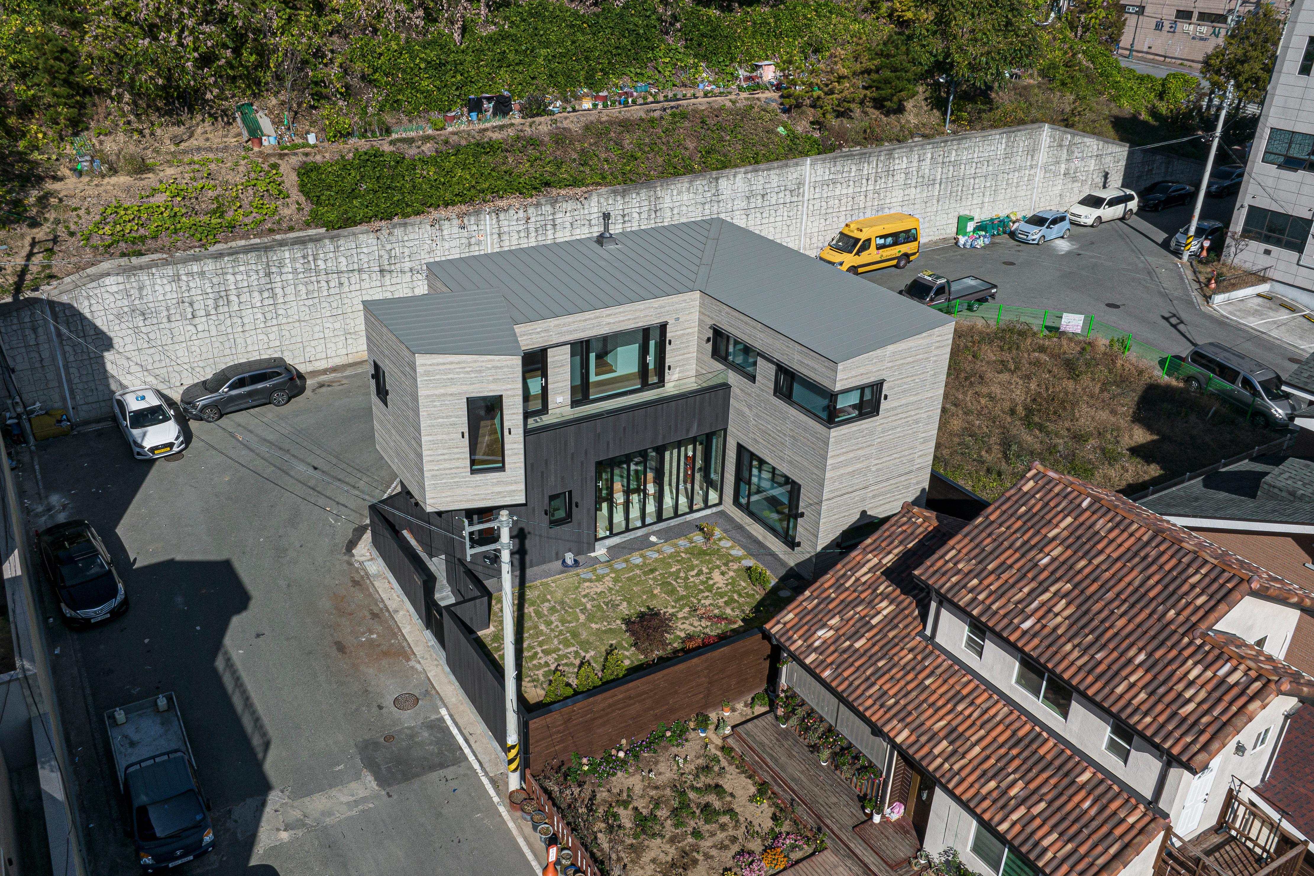 도로변 파라펫 라인 뒤로 완만한 경사의 박공지붕을 숨겨두어, 모던한 ‘플랫 루프(Flat Roof)’의 조형미를 유지하면서도 우수 처리와 단열이라는 기능적인 요구를 해결했다. 지붕의 선마저 파라펫 뒤로 겸손하게 숨기며, 집은 오로지 자신의 내면에 집중한다.
