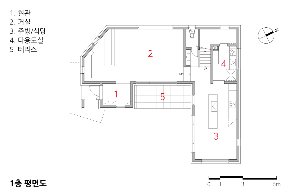 거실과 주방, 식당이 마당을 중심으로 연결되는 1층은 가족의 일상이 막힘없이 흐르는 공간이다. 요리하는 소리, 마당에서 화초를 가꾸는 모습, 거실에서의 휴식이 테라스라는 전이 공간을 통해 안팎으로 자연스럽게 교차한다. 이곳에서 창(窓)은 단순한 유리가 아니라, 안락한 실내와 푸른 마당을 하나로 묶어주는 투명한 다리가 된다.