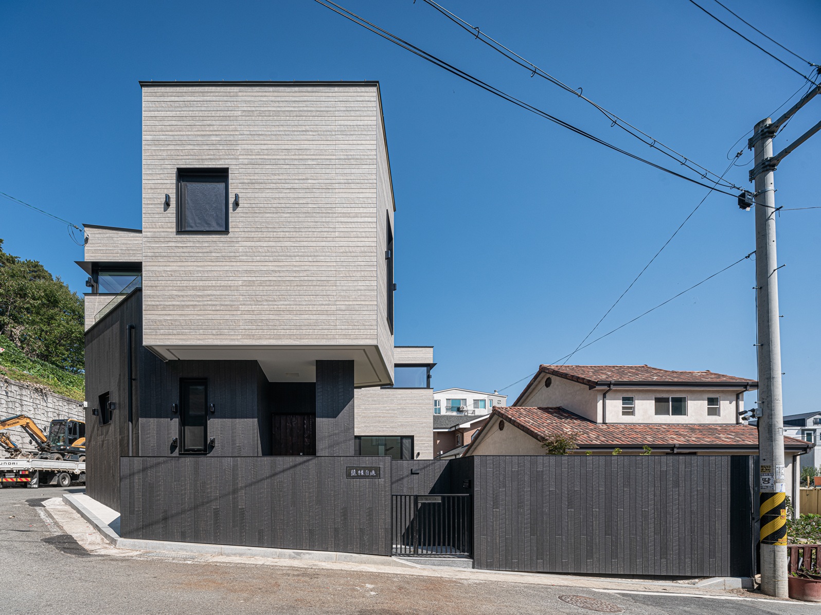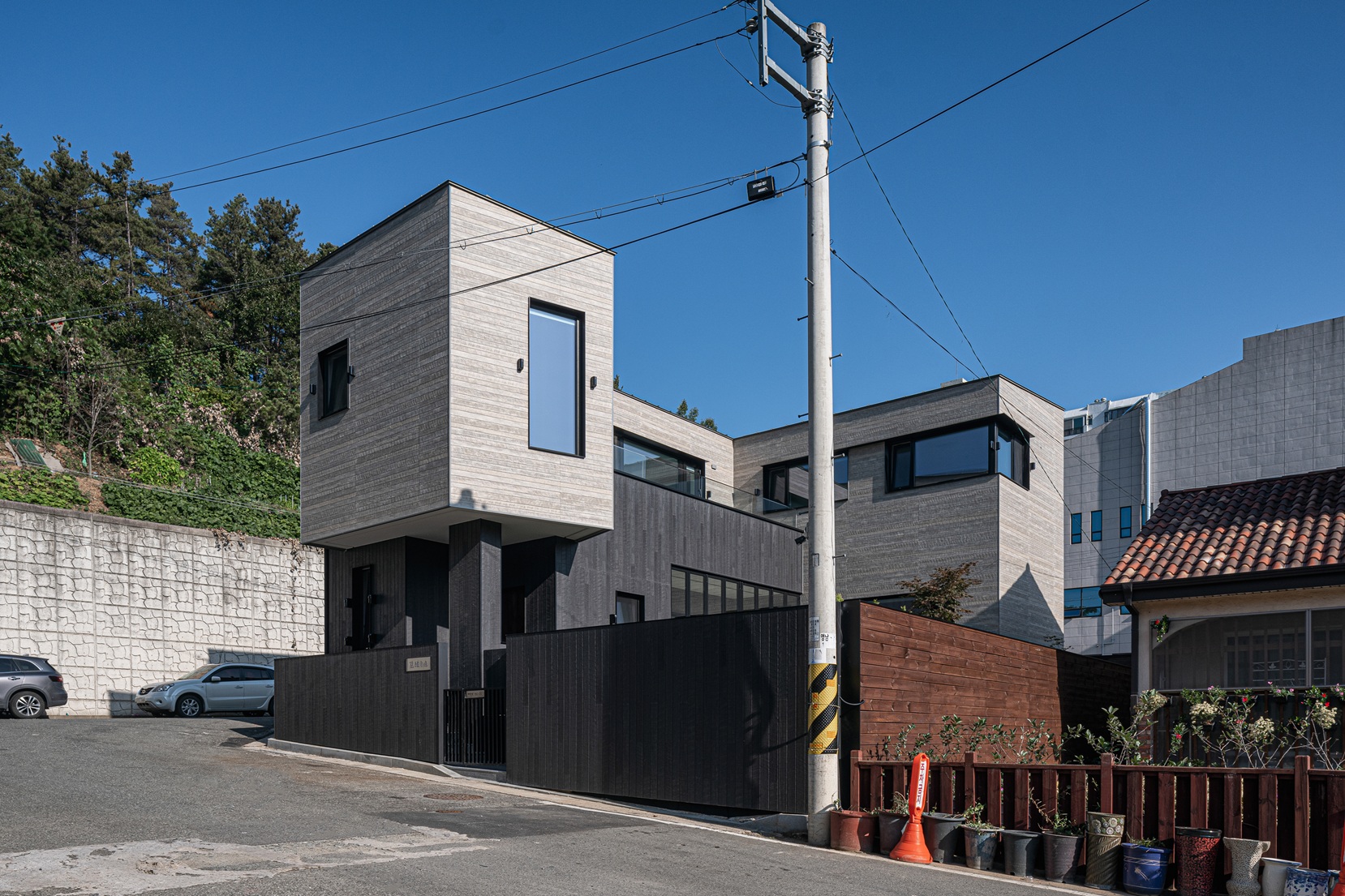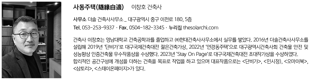 경산 사동의 주택가, 이 집은 묵직한 존재감으로 서 있다. 짙은 차콜빛의 목재 질감 위에 밝은 회색의 면이 얹혀 있는 형상은, 마치 대지 위에 단단한 바위가 뿌리내리고 그 위로 가벼운 구름이 머무는 듯한 풍경을 자아낸다. 도로를 향해 무심한 듯 등을 돌리고 서 있는 이 견고한 등은, 복잡한 주변 환경으로부터 은퇴한 건축주의 느린 시간을 지키겠다는 약속과도 같다.