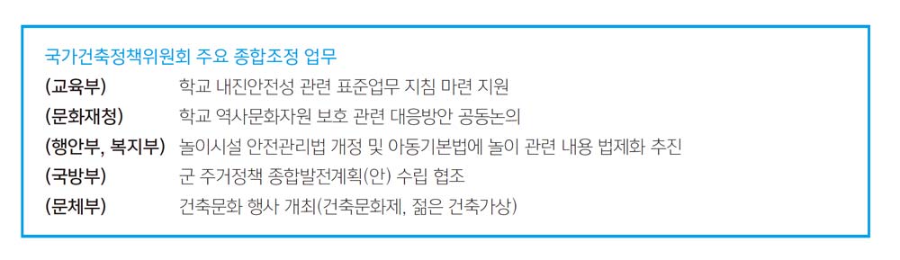 국건위가 심의·조정하는 주요 종합조정 업무로는, ▲교육부의 ‘학교 내진안전성 관련 표준업무 지침 마련’ ▲문화재청의 ‘학교 역사문화자원 보호 관련 대응방안 논의’ ▲행안부·복지부의 ‘놀이시설 안전관리법 개정 및 아동기본법에 놀이 관련 내용 법제화’ ▲국방부 ‘군 주거정책 종합발전계획안 수립’ ▲문체부의 ’건축문화 행사‘ 등이 있다. 이들 업무는 전문가 의견 수렴을 기반으로 다양한 부처, 관리 주체 간의 협의·조정으로 추진이 가능하다는 게 현장 목소리이자 건축단체의 설명이다.